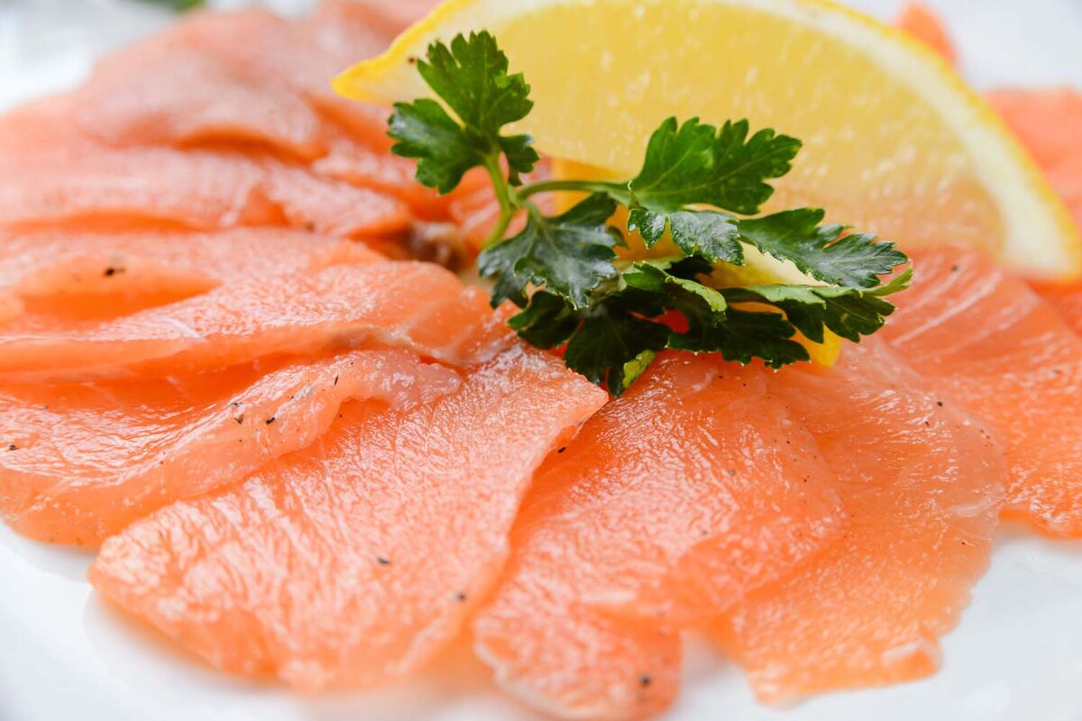 Очистить рыбу от кожи костей, нарезать тонкими ломтиками, уложить ровными рядами на блюдо или тарелку, украсить ветками зелени петрушки или листиками салата. На гарнир положить лимон, нарезанный дольками или ломтиками.