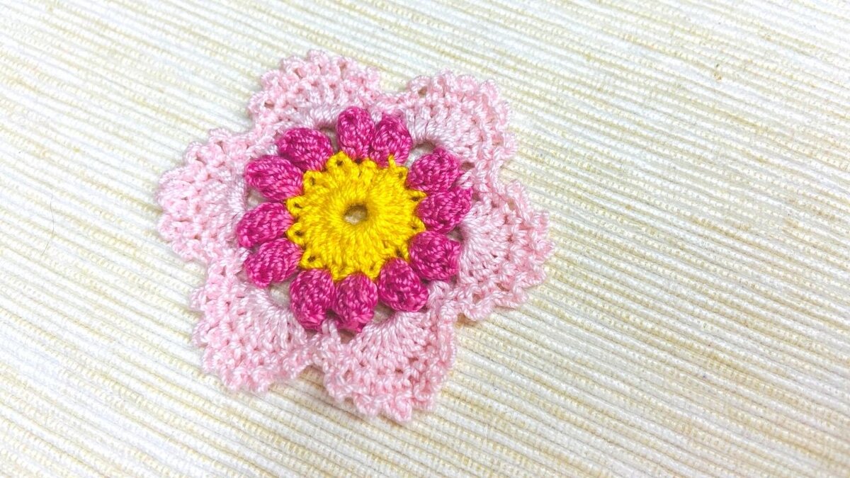 Люблю ажурные цветочки. В мою коллекцию вязаных цветов добавляю один из таких цветочков. Материалы и инструменты: Условные обозначения: Ход процесса вязания крючком цветка: Шаг 1. Возьмите желтую пряжу. Для начала вязания сердцевинки цветка наберите на крючке 7 вп, а затем замкните эту цепочку в кольцо, провязав 1 сс в в первую вп цепочки. Шаг 2. Для подъема наберите 3 вп, в кольцо провяжите 23 с1н, а для завершения ряда провяжите 1 сс в 3-ю вп цепочки в начале ряда, используя для 1 сс уже пряжу розового цвета. Шаг 3. Для подъема наберите 3 вп, в ту же петлю, откуда выходит цепочка из 3 вп провяжите еще 3 с1н. Далее извлеките крючок из последней петли, вставьте крючок в 3-ю вп цепочки в начале ряда, захватите свободную петлю и протяните ее через 3-ю вп цепочки в начале ряда. (Пропустите 1 верхушку столбика, в следующую верхушку столбика провяжите 4 с1н, далее извлеките крючок, вставьте в верхушку первого провязанного столбика, захватите свободную петлю и протащите ее через верхушк