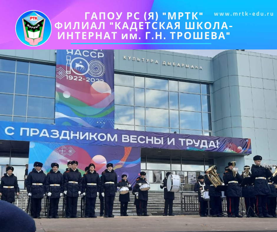 Кадеты ГАПОУ РС (Я) «МРТК» филиала «Кадетская школа-интернат им. Г.Н. Трошева» приняли участие в первомайской демонстрации в г. Мирный и в п. Чернышевский. На видео: группа РПК под руководством начальника школы Георгия Васильченко и военный духовой оркестр школы под руководством майора Евгения Зеленцова. Ссылки по теме: