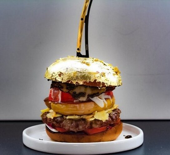Голден бой _ самый дорогой бургер в мире _цена 5469$ Его создал шеф-повар нидерландского ресторана De Daltons Роберт Ян де Веен. Рецепт: котлета из мяса вагю (мясо японской коровы, черная икра, хамон, королевский краб, белый трюфель и булочка, замешанная на шампанском Dom Perignon) . Украшает все это съедобное золото - отсюда и название "Золотой мальчик".