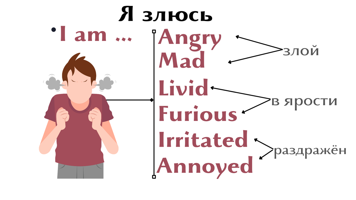 Hey, y'all! Всем привет! Эмоции бывают разные, и не только положительные. Иногда мы переживаем сложные чувства, и неплохо-бы знать как описать их на английском. Представляю вам небольшую, но эффективную подборку слов и фраз. Сохраняйте, делитесь своими примерами в комментариях 😉 1. Как сказать "Я злюсь", "Я в ярости", "Меня разражает" 2. Фразы "Меня бесит!" Example: Switch off that song! It drives me crazy / mad / up the wall / nuts! Выключи эту песню! Она меня бесит! 3. Ещё несколько моих любимых разговорых фраз. Example: You have to be very careful because he flies off the handle very easily. Тебе нужно быть осторожным с ним, он легко слетает с катушек. Example: She can flare up at the slightest provocation. Она может сорваться от любой провокации. Спасибо, что дочитали до конца 🤗 В комментариях предлагаю ответить вам на вопрос: What drives you crazy? Если вам нравится такой контент, поддержите лайком или подписывайтесь. Stay in touch! #английскийязык #английский для взрослы