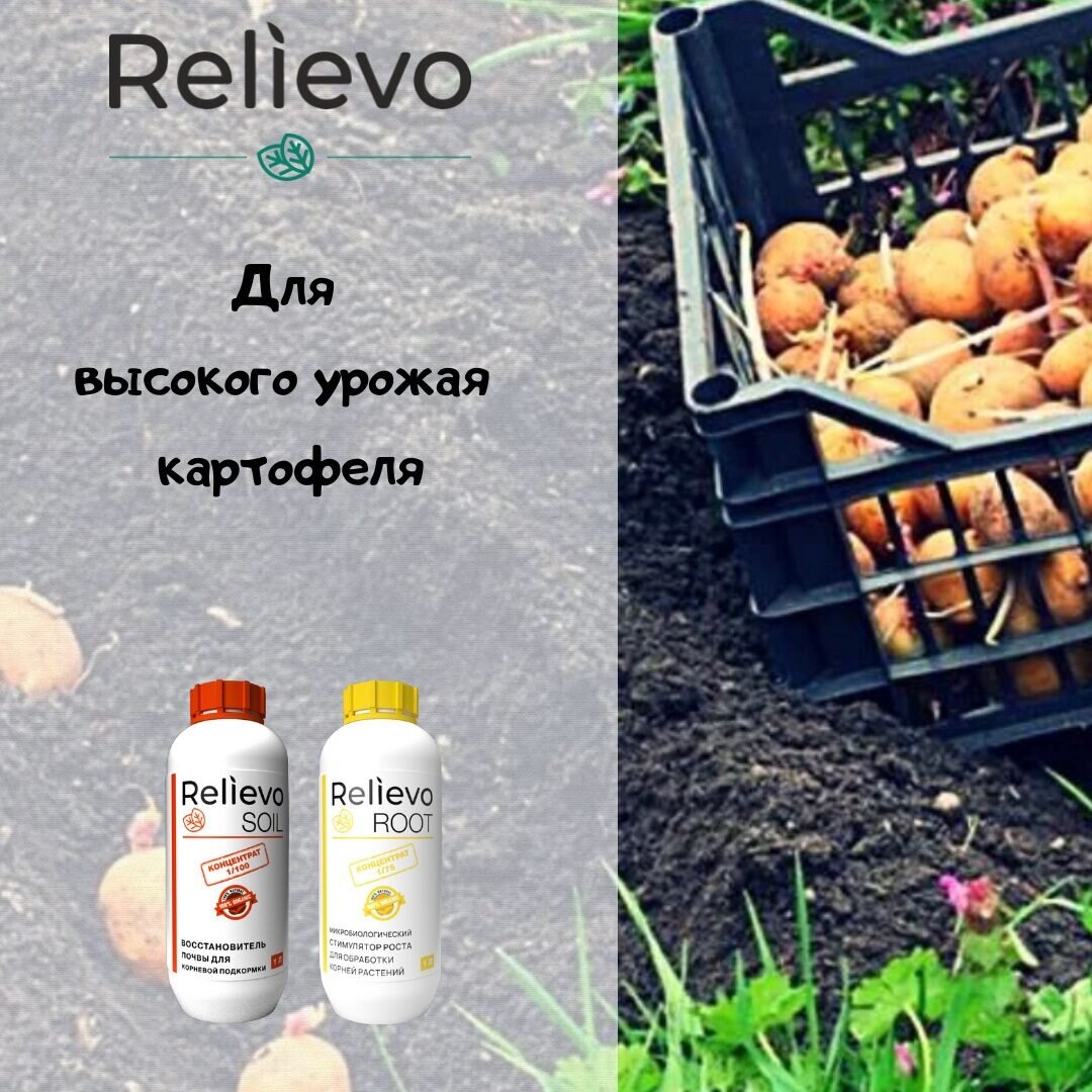 Посадка картофеля вместе с Relievo! 🌞🥔 ☀️ Начало мая — это идеальное время для посадки картофеля! Воздух и почва достаточно прогреты, температура стабильна. ☀️ Сажают на картофель в хорошую погоду, грунт должен быть прогрет на глубину 10 см., примерно до 10 градусов. 🥔 Картофель любит средние и лёгкие суглинистые, песчаные, супесчаные и черноземные грунты. Грунт должен быть влажным. 👇Глубина посадки тоже имеет значение и зависит от состава почвы. Например, в глинистом грунте, глубина должна быть не больше 3-5 см., а в песчаном 10-12 см. 🌱 Перед посадкой клубней картофеля рекомендуем обработать почву Relievo Soil, он восстановит плодородие почвы, нормализует кислотность, улучшит структуру почвы, увеличит содержание гумуса, поспособствует развитию полезной микрофлоры. Все это поспособствует формированию правильной корневой системы картофеля, тем самым повышая урожайность. ☀️ После высадки картофеля в грунт, необходим хороший уход. Чтобы посаженные клубни хорошо насыщались воздухом,