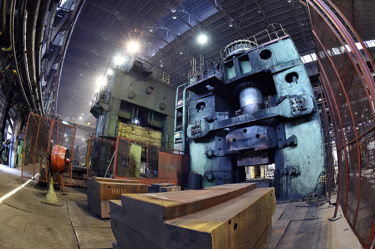 Рядом с молотом работает пресс усилием 5 тысяч тонн, он помогает агрегату доводить изделия до необходимых параметров.