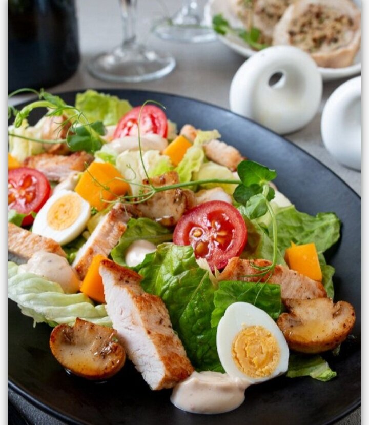 Зиме конец - пора переходить на еду полегче. Например, на сырные салаты вместо ужина. И под сытными я подразумеваю не майонезные с картошечкой, а те, что на основе салатной зелени, но с каким-нибудь белком и парой хороших вкусовых ингредиентов. Ну и с заправкой-винегретом. Сегодня будет рецепт салат с индейкой. Нет индейки - готовьте с курицей по той же схеме - все равно отлично будет. Шампиньоны хорошо заменяются вешенками, а в сезон - лисичками. Ингредиенты на 4 порции: /Основа салатные листья 120 грамм -Филе индейки 260 грамм -Соль и черный молотый перец по -Вкусу молотая паприка 1/3 ч.л. -Сухой чеснок 1/3 ч.л. -Растительное масло 2 ст.л. -Вареные перепелиные яйца 8 шт. -Чеддер или другой полутвердый -Сыр по вашему вкусу 80 грамм -Томаты-черри 140 грамм -Шампиньоны 200 грамм -Заправка перепелиные яйца 4 шт. -Растительное масло 200 мл. -Столовая горчица 1 ч.л. -Соевый соус 2 ст.л. -Яблочный уксус 1 ч.л. -Чеснок 1 зубчик -Соль и черный молотый перец по вкусу . Рец