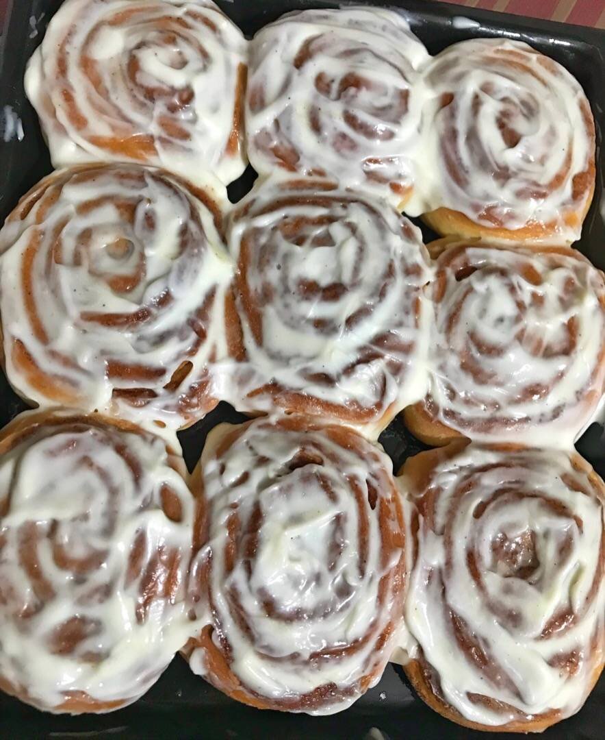 Ингредиенты: Для теста:, 🔹Мука , 🔹Яйца , 🔹Молоко , 🔹Сахар , 🔹Дрожжи , 🔹Сливочное масло , 🔹Соль , Для начинки:, 🔹Корица, 🔹Сахар , 🔹Сливочное масло , Для глазури:, 🔹Сливочный сыр , 🔹Сахарная пудра , 🔹Ванилин , 🔹Молоко Способ приготовления: В теплом молоке растворяем дрожжи с 2 ст.л. сахара, накрываем пленкой или тарелочкой. Оставляем на 10-15 минут. В большой миске взбиваем яйца с оставшимся сахаром и ванилином. Добавляем растопленное масло (не горячее), щепотку соли. Затем сюда добавляем подошедшую опару и перемешиваем. Добавляем по чуть-чуть просеянную муку и замешиваем мягкое тесто, не липнувшее к рукам. Тесто перекладываем в смазанную растительным маслом миску. Накрываем пищевой плёнкой или полотенцем и оставляем в теплом месте на 1,5-2 часа. Для начинки смешиваем сахар с корицей. Тесто кладём на рабочую поверхность присыпанную мукой. Раскатываем в большой прямоугольный пласт. Смазываем размягченным сливочным маслом и посыпаем сахарно-коричной смесью. Сворачиваем тесто