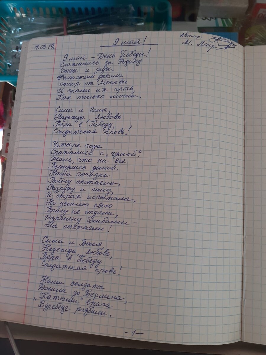 9 Мая-День Победы! Сражались за Родину Отцы и деды. Фашистам давали отпор от Москвы И гнали их прочь, Как только могли. Сила и Воля, Надежда, Любовь Вера в Победу, Солдатская кровь! Четыре года Сражались с ,, чумой,,. Жаль, что ни все Вернулись домой. Наша Отчизна Войну отстояла. Разруху и голод, И страх испытала, Но землю свою Врагу не отдали, Изранену бомбами- Мы отстояли! Сила и Воля, Надежда, Любовь, Вера в Победу Солдатская кровь! Наши солдаты Дошли до Берлина, ,,Катюши,, врага Вдребезг разбили. Молва о Победе По миру прошла, Мир наступил, но боль не ушла. Нельзя забывать Погибших солдат, Память о них Держит каждая мать. 9 Мая-День Победы! Пройдём мы парадом За отцов и дедов! Память о них Будет вечна, всегда! Не будет забыта Мировая война! Низкий поклон Всем матерям, Солдатам-героям, Тыловикам! Всем тем, Кто выжил в войне, Кто не оставил Солдата в беде. Светлая память Погибшим в бою, Тем,кто защищал Землю свою. Детям войны Низкий поклон, Пусть их хранит Ангел и Бог! 9 Мая! Пр
