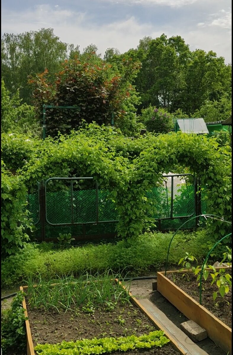 Малина арками🌈 Зачем? Смотрится интересно, аккуратно и эстетично Собирать удобно! И место экономится на участке! В качестве каркаса - покупные металлические 4х-метровые дуги Ширина ~1,5м Высота ~1,3м Для дополнительной опоры между ними заколочены небольшие железные колышки. Когда листочки распустятся, их будет совсем не видно за зеленью Конструкцию мы не убираем круглый год! 🌱 У каждой "ноги" примерно по 3-4 саженца. Корень посажен у основания дуги, а макушка огибает арку, и оказывается рядом с землей со второй стороны этой же дуги. Макушка обычно продолжает расти. И чтобы не загущать посадки, мы ее внизу образаем, не давая укорениться в земле. Если Вам нужно больше кустов, то обрезать не нужно У нас так посажена черная малина. Точный сорт не знаем (немного похожа на Кумберленд) В отличие от обычной малины, эта не расползается! Никаких вкапываний для ее ограничения не делали, ведет себя прилично 😂 Про уход: Весной рыхлю землю плоскорезом И сею фацелию, любимый сидера