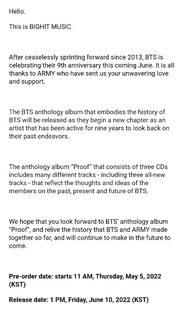 Сегодня на ютуб канале был выпущен тизер к альбому BTS, в котором показали название и логотип нового альбома, который выйдет 10 июня 2022 года. Так же позже на Weverse BTS было обновление: Здравствуйте. Это BIGHIT MUSIC. После непрерывного бега вперед с 2013 года BTS празднуют свое 9-летие в июне этого года. Это все благодаря ARMY, которые слали нам свою непоколебимую любовь и поддержку. Альбом-антология BTS, олицетворяющий историю BTS, будет выпущен, когда они начнут новую главу как артисты, которые были активны в течение девяти лет, чтобы оглянуться на свои прошлые начинания. Альбом-антология "Proof", состоящий из трех компакт-дисков, включает в себя множество разных треков, в том числе три совершенно новых трека, которые отражают мысли и идеи участников о прошлом, настоящем и будущем BTS. Мы надеемся, что вы с нетерпением ждете альбома-антолгогии BTS "Proof" и оживите историю, которую BTS и АРМИ сделали вместе до сих пор и продолжат делать в будущем. Дата предзаказа: начал