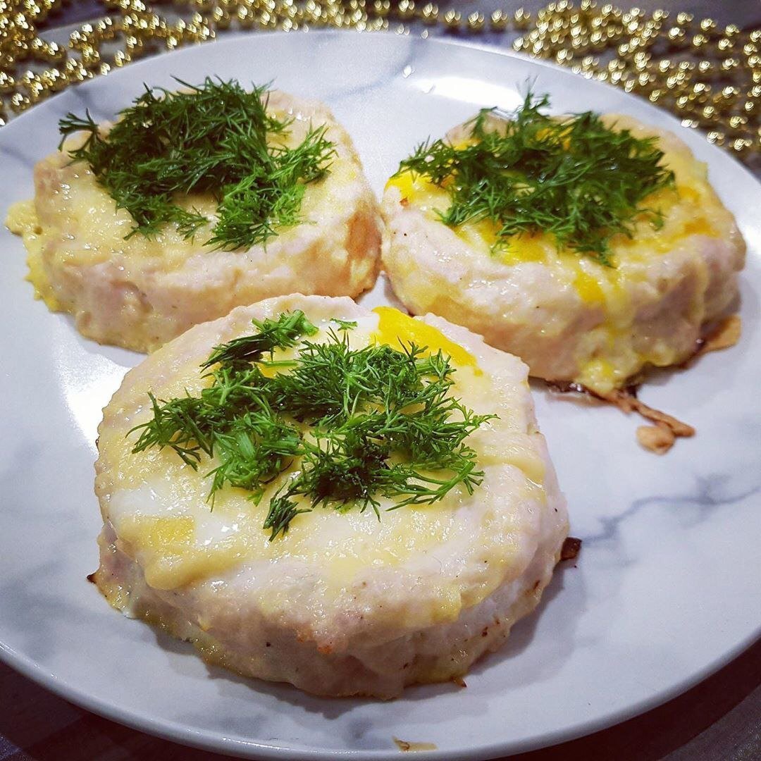 КБЖУ на всю порцию:785/115.08/27.91/11.47 ⠀ ⠀ Ингредиенты: куриное филе-350 гр яйцо-4 шт(1 яйцо в фарш идёт) сыр-40 гр(лучше брать лёгкий) зелень ⠀ Приготовление: 1)Делаем фарш из куриной грудки,прокручиваем мясо с луком,выдавливаем пару долек чеснока,добавляем яйцо, соль,перец по вкусу. 2)Делим фарш на 3 равные части и формируем наши ватрушки,так чтобы стенки были повыше,ведь мы туда будем разбивать яйцо. 3)Отправляем их в духовку(я выпекаю на силиконовом коврике) на 10 минут при 180 градусах. 4)Далее на каждую ватрушку выбиваем по яйцу,у меня они были красноваты,я часть белка с каждого оставила на сырники,чтобы потом не собирать яйца по всему коврику,они могут вытечь. 5)Сверху на яйцо посыпаем тертый сыр. 6)Запекаем еще 5-10 минут и наши вкусные ватрушки готовы. 7)Украшаем зеленушкой и наслаждаемся!