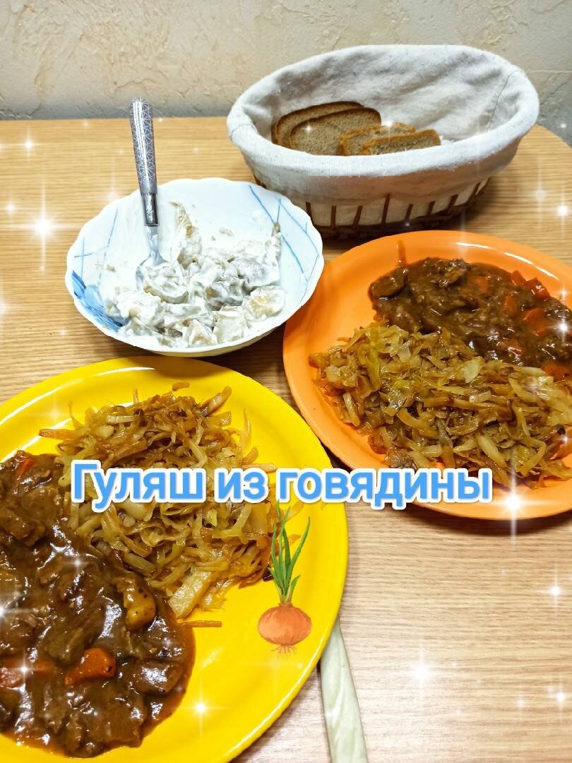 Благодарю за вдохновение автора Кукпад-Алтынка @altyn_home_cook Давно я не готовила такой вкусный гуляш. Тут есть один момент, это мясо лучше делать на сливочном масле. Поверьте мне, так будет ОЧЕНЬ вкусно!!! #академия Ингредиенты: говядины, моркови, крупная луковица, муки, чеснока, масло топлёное сливочное, аджики или томатной пасты (очень хорошей), специи на ваш вкус, соль, вода Способ приготовления: Вот такой набор продуктов нам нужен. Нарезать мясо крупным кубиком. Сковороду с маслом хорошо разогреть, до дымка, и бросить туда мясо. "Запечатать" таким образом мясной сок. Образуется корочка. На другой сковороде жарим лук до прозрачности. Добавляем просеянную муку к луку и жарим ещё минуты 3-4. К мясу добавить морковь и аджику. Положить лук и влить ГОРЯЧЕЙ воды по чуть-чуть. Перемешать, чтобы не было комочков. Воду регулируйте сами. Закрываем крышкой, делаем огонь самый маленький и тушим мясо ДОЛГО. Кладём специи и соль. Делаем гарнир. У меня жареная свежая капуста. Всё готово 👍 Раск