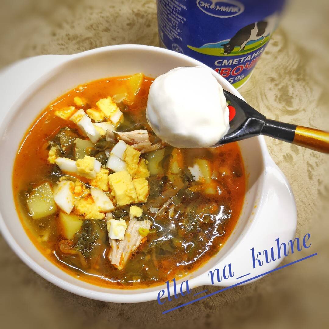 Вкусно и просто. Ингредиенты: бедро домашней курицы, морковь, луковица, томатной пасты, чеснока, картофеля, щавеля, Соль, специи , яйца Способ приготовления: Куриное бедро отварить в подсоленной воде с лавровым листом. На растительном масле спассеровать мелко нарезанный лук и натëртую морковь. К овощам добавить пасту, перемешать и влить пару половников бульона. Добавить нарезанное мясо, чеснок, специи. В готовый бульон выложить картофель, довести до полуготовности. Выложить нарезанный щавель и содержимое сковороды. Яйца отварить, мелко нарезать и выложить в суп. Приятного аппетита😍! Если вам по душе мои незатейливые рецепты: подписывайтесь и оставляйте свои фотоотзывы📸!