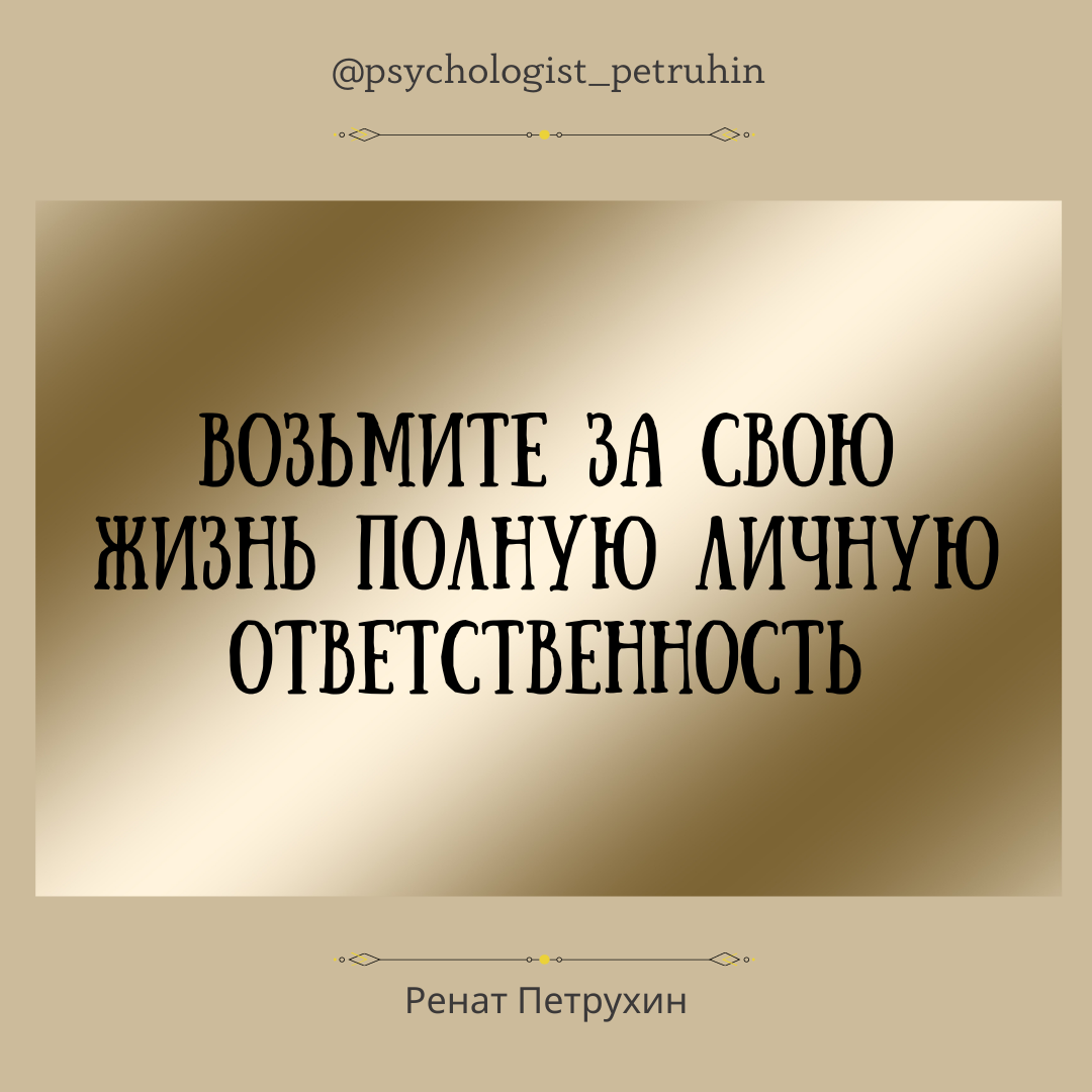 Возьмите за свою Жизнь полную личную ответственность. Вот за всё, что есть в вашей жизни, возьмите ответственность. Прямо сейчас. Никто вас не просит нести ответственность за других, возьмите за свою хотя бы. Возьмите ответственность за то, как вы выглядите, что говорите, как общаетесь, за то, что выносите в этот мир, за продукты своей психической деятельности. За своё здоровье, за пищу, которую едите, за свою работу, за свои увлечения, интересы, за благоустройство Жизни, за свои мысли и чувства, за отношения, которые создаёте с другими людьми, за своё настроение и свои эмоциональные состояния, за свои навыки, способности, за своё личное развитие и т.д. Возьмите личную ответственность за всё, что вы делаете в своей жизни. Это и есть личностный рост. Как только возьмёте ответственность – у вас появятся силы, радость и энергия жить и делать многое. Возьмите личную ответственность за своё будущее: кем вы станете, какой жизнью будете жить в старости. Личная ответственность – это способност