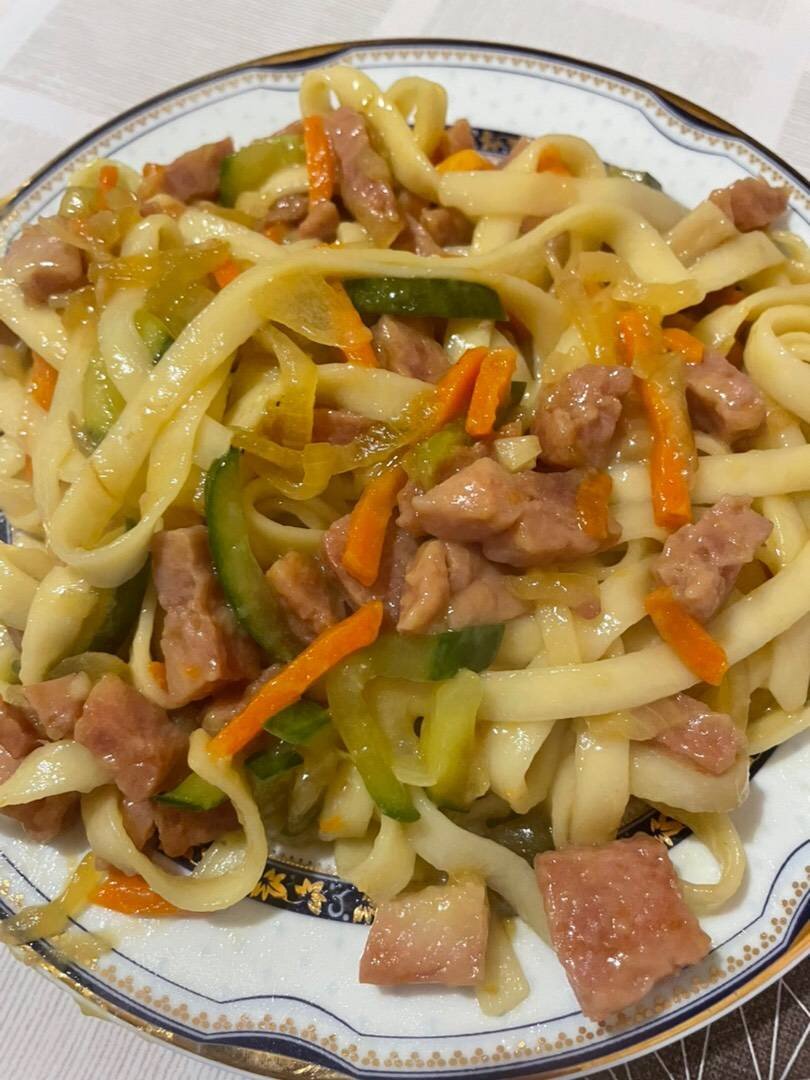 Ингредиенты: Лапша Удон, Ветчины (можно заменить куриным филе), Лук репчатый (крупный), Морковь (средняя), Болгарский перец, Огурец, соевый соус, соус терияки, Соль/перец , Кунжут (по желанию) Способ приготовления: Нарезаем соломкой лук, болгарский перец, морковь, огурец! Если используете куриное филе, то его тоже нарезаем соломкой! У меня ветчина, нарезала кубиками! На растительном масле обжариваем ветчину (куриное филе до золотистого цвета), добавляем лук, морковь! Обжариваем ~5 минут! Нагреваем воду, солим, отвариваем удон на 2 минуты меньше, чем указано на упаковке. Добавляем болгарский перец и огурец! Обжариваем 1 минуту! Затем добавляем соевый соус и соус терияки! Перемешиваем и тушим 1 минуту! Соединяем с лапшой, тушим ещё 1 минутку на маленьком огне и выключаем огонь. По желанию можно добавить зелёный лук и кунжут! Это очень вкуссно!😋
