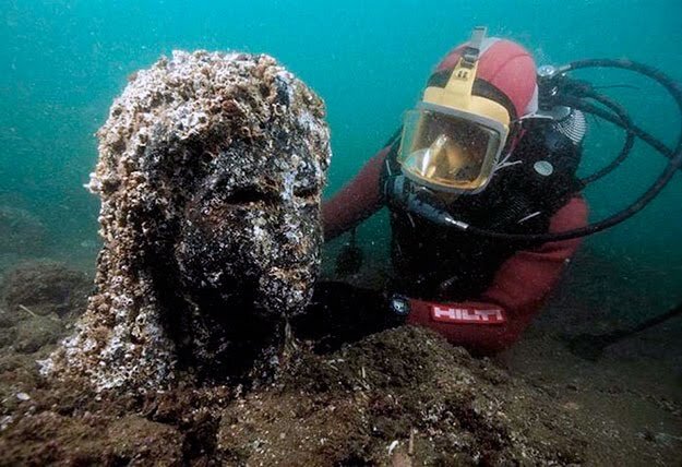 История древнего Гераклиона очень похожа на историю Атлантиды. Гераклион располагался в устье Нила и был небольшим процветающим городом, а его жители были людьми умными и образованными. Но буквально в одно мгновение Гераклион просто исчез. Это произошло в 1 веке до нашей эры, когда сильное землетрясение разрушило дома, потопило корабли и погубило почти все население. Выжившим пришлось спасаться бегством, бросив все свое имущество. 1) Историки часто упоминали этот город, так Диодор писал, что когда Геракл преградил течение Нила, спасая жизнь людям, они воздвигли храм в его честь и назвали город его именем. В записях Геродота сказано, что Елена Прекрасная, пытаясь скрыться от мужа, хотела сбежать со своим возлюбленным Парисом именно в Гераклион. 2) О нем бы никто не узнал, если бы не известный морской археолог Франко Годдио в 2000 году не начал исследовать бухту Абукир. И только в 2012 году он подтвердил, что нашел именно Гераклион. В доказательство этому из воды подняли черную гранитн