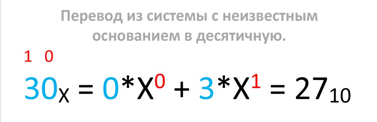 Условие. В системе счисления с некоторым основанием десятичное число 27 записывается в виде 30. Укажите это основание. Решение. Тут нам необходимо знать перевод между системами счисления. В частности перевод в десятичную. Ответ: 9.