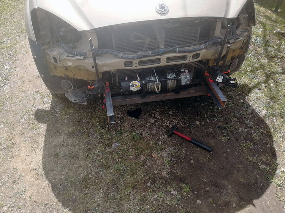 Всем здравия, с прошедшими и наступающими тоже! Довольно продолжительные первомайские праздники пришли и наконец решил я откосить от посадки картошки и разбавить пожирание шашлыка/водки/пива установкой лебедки. Лебедка с текущими ценами, разумеется, кетай) Почитав отчеты по установке, был выработан план: ставить не на штатный усилитель, максимально низко и максимально в базу. Итак, был закуплен швеллер 80мм (2 метра на авито за тыщу рублей), в гараже найдено 3 отрезка уголка 50мм сантиметров по 80-90 (бесплатно), на дачу взят весь этот металлопрокат, сварка, болгарка, дрель и остальные подручные инструменты. Краску еще купил — хамерайт — для ржавых дачных заборов. Прикинул, кайрон недалеко ушел, так что в самый раз. Не буду вас томить, поехали. Кайрон без лифта кузова. Разбираем морду, отрезаем 2 куска швеллера 80мм по 0,5 метра примерно, на швеллере спиливаем с обоих узких стенок по 1,5см ширины и длинной по 14см, чтобы вошел в раму. Суем в раму, накидываем уголки, прикидываем распо