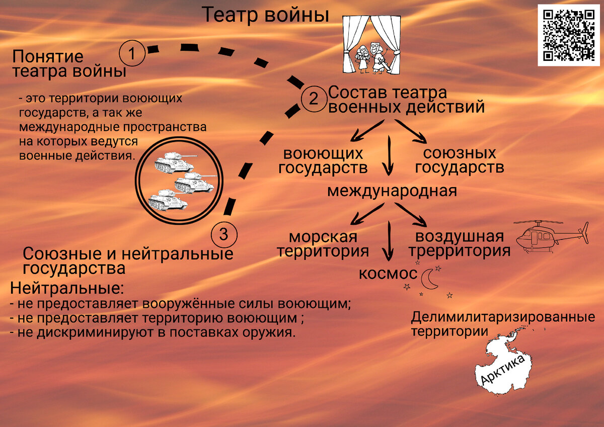 Содержание опорного сигнала: 1. Понятие театра войны. 2. Состав театра военных действий. 3. Союзные и нейтральные государства. Понятие театра войны. Международное право стремиться локализовать войну, если уж в конкретном случае обойтись без неё невозможно. Для этого была локализована территория, на которой ведутся военные действия и субъекты, которые оказывались вовлечённые в войну. Театр военных действий (театр войны)- это территории воюющих государств, а так же некоторые международные пространства на которых ведутся военные действия. То есть, военные действия не могут вестись на территориях государств не участвующих в войне или объявивших о своём нейтралитете. Состав театра военных действий. В состав театра военных действий относят: - территории воюющий государств; - территории союзных государств; - международные территории. Международные территории в театре войны: - водные (открытое море и район); - воздушные; - космические. Некоторые международные территории объявлены демилитаризов
