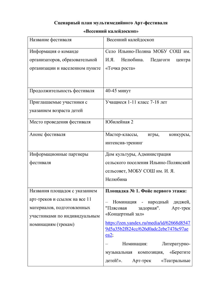 Cценарный план мультимедийного Арт-фестиваля "Весенник калейдоскоп"