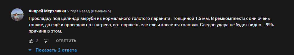 В моём случае стук был в головке цилиндра. По началу я не мог понять в чём же дело, думал что стучит цепь. Снимал генератор чтобы снять цепь ГРМ, натяжитель - посмотрел, всё нормально. А на третий день нашёл в комментариях под одним видео что это стук поршня о клапана, и там также было сказано что нужно установить толстую прокладку из паронита под цилиндр. Вот данный комментарий: Только в моём случае была произведена замена прокладки между цилиндром и головкой и новая прокладка оказалась тоньше, поэтому появился стук. Вот такую прокладку я вырубил Разница в толщине большая. А пока я искал причину, снимал и снова ставил на место головку цилиндра порвалась прокладка крышки головки и пришлось вырубить новую Если данная статья была тебе полезна подпишись на канал и задай свой вопрос, будем разбираться вместе.