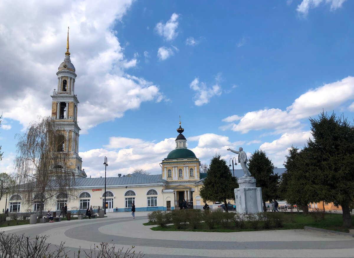 Одно из моих любимых мест в этом подмосковном городе - площадь Двух революций, которую я называю "то самое место, где весёлый Ленин призывает народ идти молиться". Ну правда же, он словно показывает дорогу к храму :)). Хотя, может, и на старинные торговые ряды, где сейчас работает супермаркет "Дикси"... В 16 столетии храм находился внутри кремля. Именно к тому времени относится создание иконы-барельефа «Богоматерь с Младенцем Христом и предстоящим апостолом Иоанном Богословом». Тогда это творение итальянских мастеров, строивших кремль, находилось над крепостными воротами, ведущими к храму. Храм несколько раз перестраивали. Последний раз это произошло в начале 19 века. Тут возвели новую колокольню взамен старой, а вокруг храма и колокольни расположили торговые ряды (на арендную плату и содержались храм и школа). Храм закрылся в 1929 году и снова открылся только в конце 1990-ых. Высота колокольни - 67 метров. Сейчас можно подняться на смотровую площадку и рассмотреть исторический центр