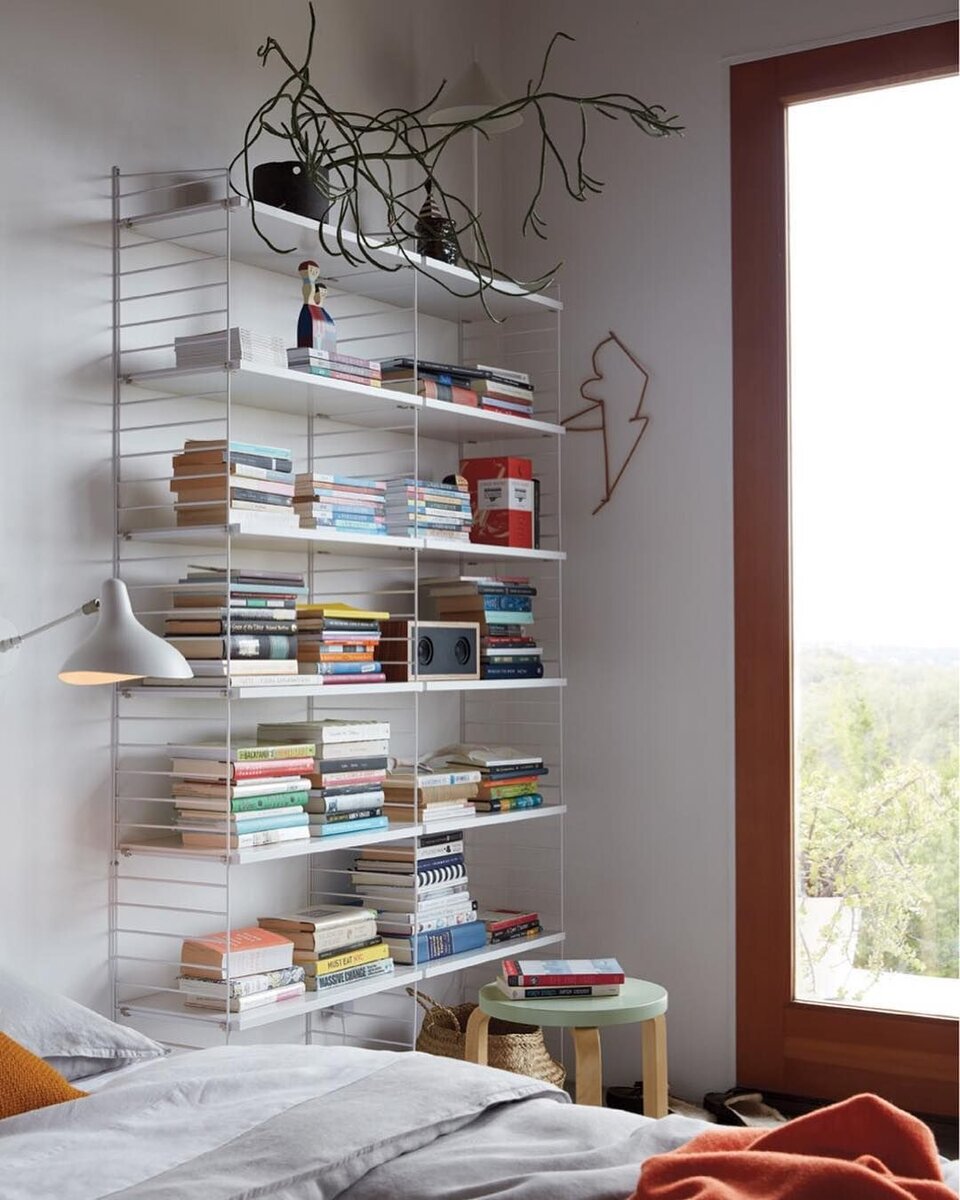 Наверное, все из вас видели не раз полки на металлическом каркасе на фото скандинавских квартир. В этом интерьере модульные полки использованы в спальне. Это давняя и очень популярная в Скандинавии система String. Может показаться странным, что такой скромный предмет интерьера, как полки String, стал классикой дизайна. В 1949 году известный шведский издатель Бонье объявил конкурс: если шведы хотят покупать книги, им нужна практичная, недорогая и простая в сборке система книжных полок. У дизайнера и архитектора Ниссе Стриннинга родилась идея полок String, которая получила первый приз и на многие годы стала хитом среди систем хранения. Полки легко перемещать, а когда требуется дополнительное место, вы можете добавить дополнительные элементы, система легко собирается и легко трансформируется. Немногие помнят, что идея этих полок была скопирована в СССР в небольшом формате и до сих пор аналоги таких полок встречаются на Авито. Понравилась статья? Делитесь своими эмоциями в комментариях👇
