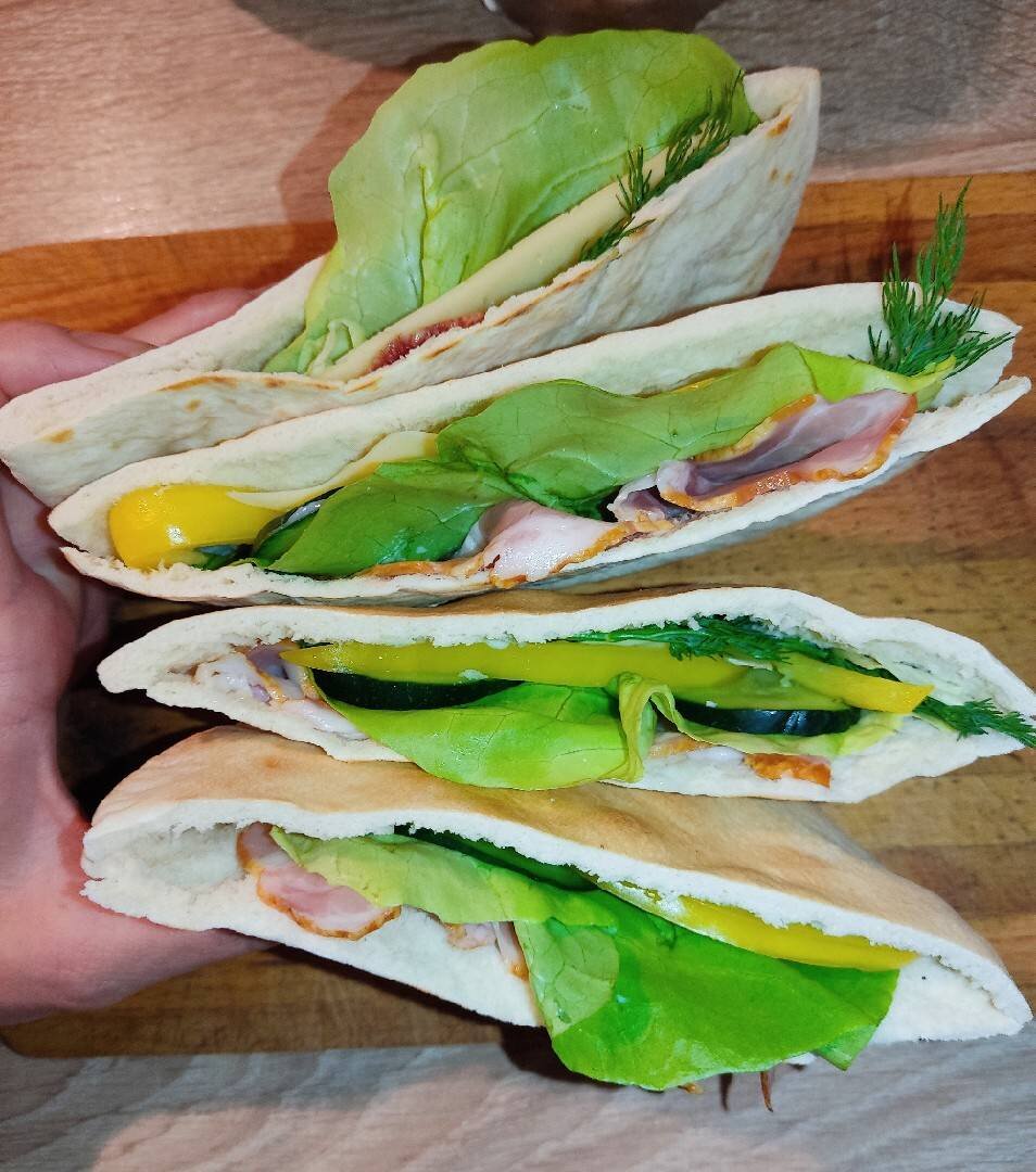 Готовлю на завтрак, в школу. Отлично подойдёт с собой в дорогу. Ингредиенты: Лепёшки, Огурец, Помидор, ещё можно болгарский перец, Ветчина или бекон, можно колбасу, Салатный лист или любая другая трава (на ваше усмотрение), Творожный сыр или плавленый, Сыр обычный Способ приготовления: Берём лепёшки разрезаем. Затем подсушиваем с двух сторон я это делаю на сухой сковороде. Одну внутреннюю сторону смазываю плавленым сыром или творожным кто, что любит больше. И начинаем закладывать нашу начинку. Салатный лист и. т. д. Получается очень вкусно Если не сразу кушаете, потом можно подогреть в микроволновке
