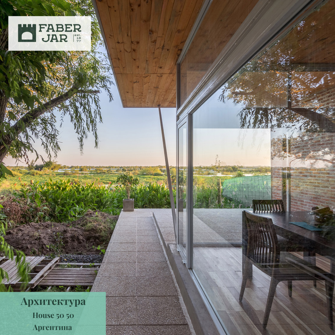 Офис архитекторов Celula Urbana спроектировал дом под плоской крышей для участка, окруженного деревьями и диким кустарником, к юго-западу от города, на берегу Рио-Коронды. "Все началось с прекрасного ландшафта, типичного для побережья, где водно-болотные угодья и биоразнообразие остаются вокруг", - объяснил архитектор Хуан Пабло Темпорелли.🌳 Дом назван "House 50 50" – в связи с его наполовину внутренним, наполовину наружным дизайном - и имеет L-образную форму в плане, обрамляя подъездную дорогу у входа в собственность. 🏡Крыша имеет ту же L-образную форму, укрывая террасы на двух концах здания и дорожку, которая соединяет их. "Галерея, спроектированная как соединение искусственного и естественного, приобретает актуальность в проекте, который имеет 50 кв.м крытых и 50 кв. м. полупокрытых", - сказал Темпорелли. Материалы остаются открытыми повсюду, создавая продолжение между внутренним и наружным пространствами. Они варьируются от красных кирпичей, которые образуют стены, до д