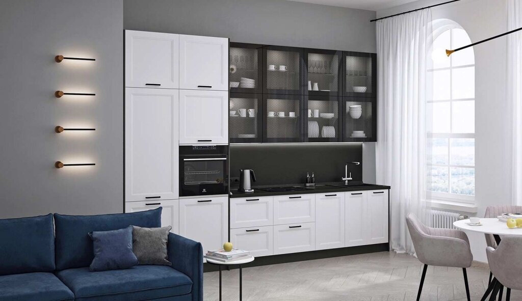 Неоклассика. Белые фрезерованные фасады, шкафчики со вставками из стекла и крупные молдинги отлично сочетаются с темными столешницами. Практичность использования в таких кухнях сочетается с оригинальными формами, доставшимися им от классического стиля.