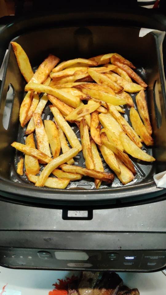 Картошка получается изумительно с маленьким добавлением подсолнечного масла без запаха #французскаякухня гриль Ninja Ингредиенты: картошек, Соль , Перец черный молотый, Чеснок сухой, Масло подсолнечное без запаха Способ приготовления: Картофель чистим, нарезаем длинными под картофель фри, полили маслом, поперчили, посолили по вашему вкусу и слегка перемешали, жарим в разогретом гриле Ninja15 минут. После 5 минут перемешать и можно добавить для запекания отваренный говяжий язык (или что у вас есть.