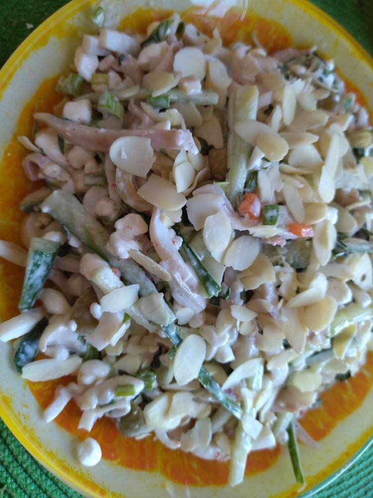 "Ты не думай с презреньем: "Какие мелкие семена!" Это ведь красный перец." 🌶️ Сегодня хокку-день, а также Всемирный день разума и День общения? Пообщаемся разумно?#пикник Ингредиенты: кальмаров, зернёного творога, оливок, начинённые красным перцем, среднего размера свежий огурец, зелёного лука, миндальных лепестков, зелёного базилика, красного молотого перца, соли, йогурт мои густая ряженка для заправки, лавровых листа, небольших зубца чеснока, мускатного ореха Способ приготовления: Вскипятить воду, посолить, положить лавровые листы. Кальмары положить в уже кипящую воду, подержать ровно 3 минуты. Вынуть и сразу поместить под очень холодную воду. Остуженные, порезать тонкой длинной соломкой. Тоже тонкой длинной соломкой нарезать неочищенный огурец. Оливки порезать поперек на 3 части каждую. Базилик порвать руками. Мелко порезать зелёный лук и чеснок. Все указанные ингредиенты соединить. Добавить перец, мускатный орех и зерна творога. У нас он в сливках, так что и сливочки попали, за сч