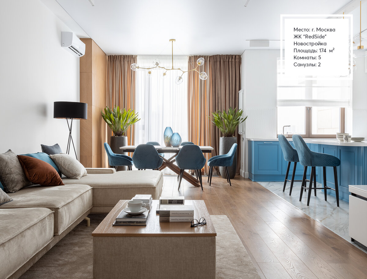 Квартира в 174 м² расположена в самом центре Москвы – в современном ЖК “RedSide” в районе Красной Пресни. Здесь на высоте 23 этажа дизайнеры студии Teremok.Design, Василий Воробьев и Павел Лагутин, создали тихую гавань по проекту заказчиков.