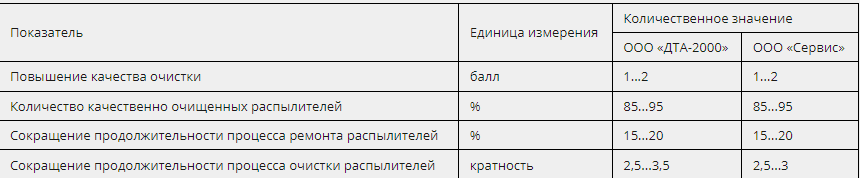 Полученный экономический эффект рассчитан только за счет снижения трудоемкости технологического процесса ремонта распылителей. Кроме того, существенно повышается качество очистки, культура труда и значительно сокращается использование экологически- и пожароопасных органических растворителей.