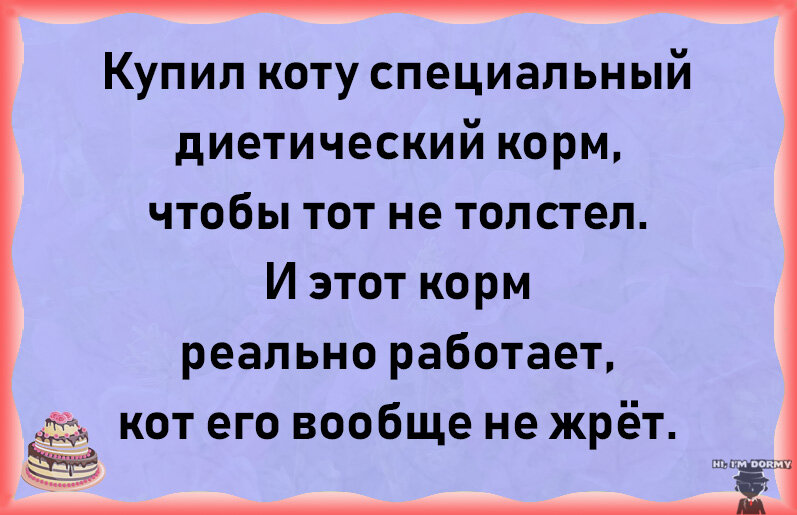 Здравствуйте, дорогие и уважаемые друзья! Сегодня, 6-го мая, приглашаю вас внешне и внутренне отметить Международный день против диеты. Всех же, кто в столь замечательный день по различным причинам не может присоединиться к нашему разнузданному чревоугодию, прошу нас понять и простить. Анекдот 1 Анекдот 2 Анекдот 3 Анекдот 4 Анекдот 5 Анекдот 6 Анекдот 7 Анекдот 8 Анекдот 9 Анекдот 10 Желаю вам приятного аппетита и отличного настроения. С уважением и гастрономическим приветом от Дорми, Г. Костин.