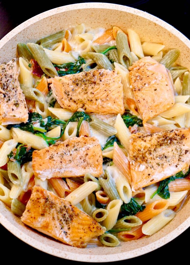 #пикник #ужин #рыба Ингредиенты: паста пенне, филе красной рыбы (лосось, форель), приправа Итальянские травы , растительное (оливковое) масло , чеснока, вяленые томаты в масле, мука , молоко, свежий шпинат Способ приготовления: Поставьте вариться пасту. Рыбу посолите, поперчите, посыпьте Итальянскими травами. Обжарьте на растительном масле на среднем огне по 3-4 минуты с каждой стороны. Выложите на тарелку. В ту же сковороду добавьте мелко порезанный чеснок и вяленые томаты кусочками, готовьте 1 минуту, затем добавьте муку и перемешайте. Понемногу вливайте молоко, постоянно помешивая, до однородного соуса. Добавьте шпинат и готовьте 3-4 минуты, до размягчения шпината. Посолите, поперчите по желанию. Выложите в сковороду отваренную пасту, перемешайте и оставьте прогреться 1-2 минуты. Рыбу разомните вилкой на крупные кусочки. Снимите сковороду с огня и выложите рыбу к пасте.