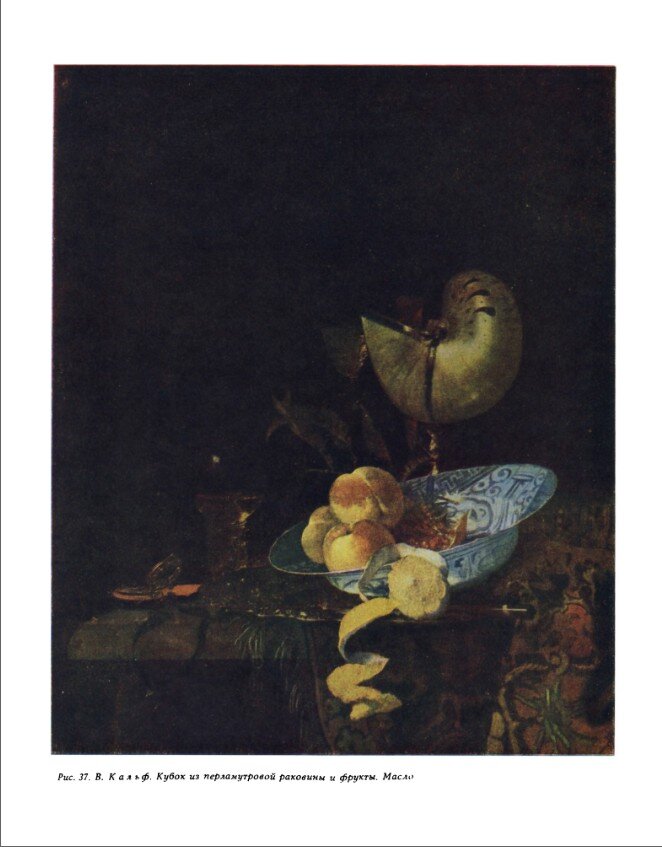 Так , в картине Кальфа художник выделяет и расположением, и цветом, и светом как главное в натюрморте лежащие на тарелке фрукты и раковину. Натюрморты даже из одних и тех же предметов в каждом отдельном случае могут иметь свой особый строй композиции.