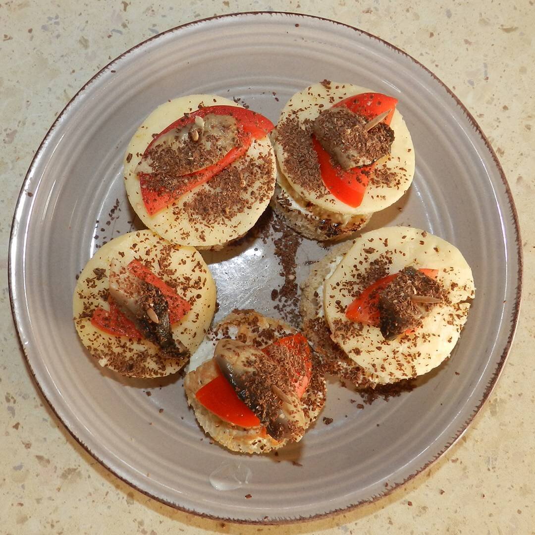Всем привет! Удивите гостей различными закусками, превосходно. Ингредиенты: индейки, хлеба, йогуртового соуса, кружочков сыра, порезанных помидоров, порезанных грибов, горького тертого шоколада Способ приготовления: Обжарьте кружочки индейки без добавления масла с двух сторон, подогрейте кружочки хлеба. Нарежьте кружочками сыр. Намажьте хлеб соусом, выкладывайте сначала индейку, потом сыр, затем помидор, конец грибы. Прокалывайте зубочисткой и посыпайте тертым горьким шоколадом. БЕЛКИ 12.06, ЖИРЫ 7.81, УГЛЕВОДЫ 10.53, ККАЛ 162.02