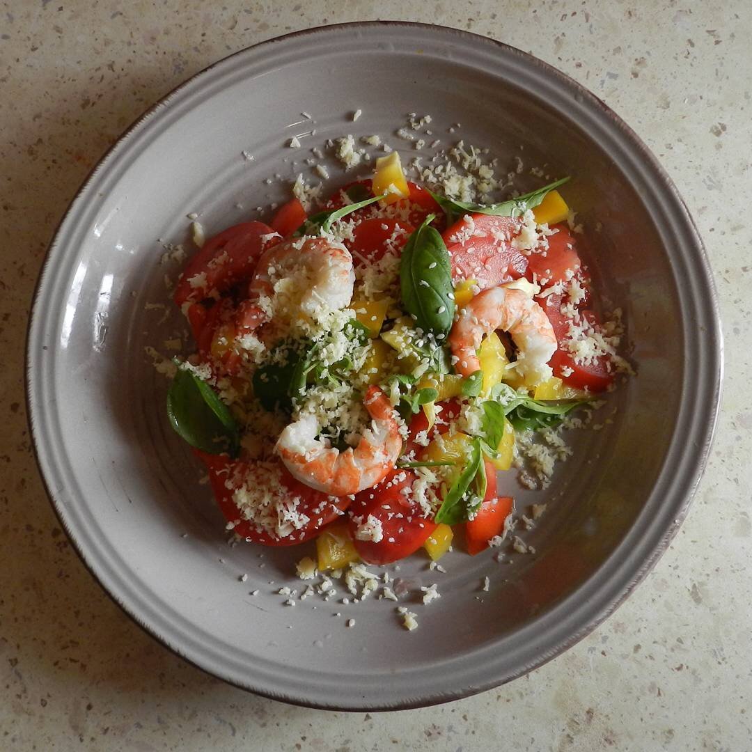Всем привет! Я очень люблю морские блюда кроме мидии. Ингредиенты: помидор, варёных грибов, жёлтого перца, чеснока, густого йогурта, тертого сыра, варёных аргентинских креветок, свежего базилика, свежего рукколы, свежего орегано, кунжут Способ приготовления: Нарежьте не крупно индейку, крупно болгарский перец, вдоль пополам миндаль, выложите все овощи, индейку, подавайте запеченный лук и полейте йогуртовым соусом на большую тарелочку, порвите базилик, руколлу, орегано, посыпайте миндалем и горьким шоколадом. БЕЛКИ 7.65, ЖИРЫ 5.95, УГЛЕВОДЫ 7.38, ККАЛ 115.51
