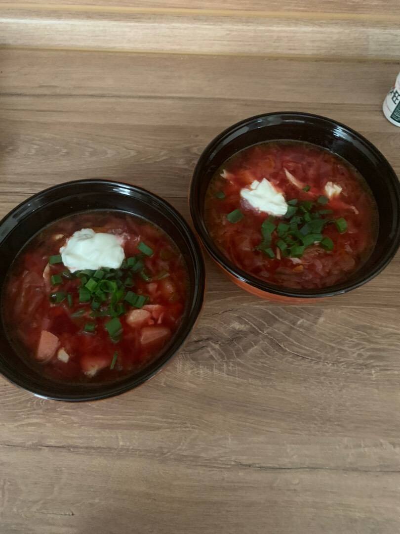 Борщ один из самых любимых первых блюд моей семьи, чтобы он получился вкусным, наваристым и ярким есть некоторые условия.1. Для получения ароматного бульона, стоит класть мясо в холодную воду, тогда мясо ее пропитает. 2. Не каждый сорт свеклы дает красивый цвет борща, угадать, к сожалению ,в магазине невозможно какая она внутри, я покупаю просто с самой тёмной кожурой и без повреждений. 3. Пережаривать свеклу не долго и добавлять в самую последнюю очередь и варить недолго, 4. Уксус добавляю для сохранения цвета, но главное не переборщить, можно начать с 1 ст. ложки, чтобы понять сколько вам подойдёт по вкусу. 5. Хмели - сунели мне кажется очень сочетается с борщом.