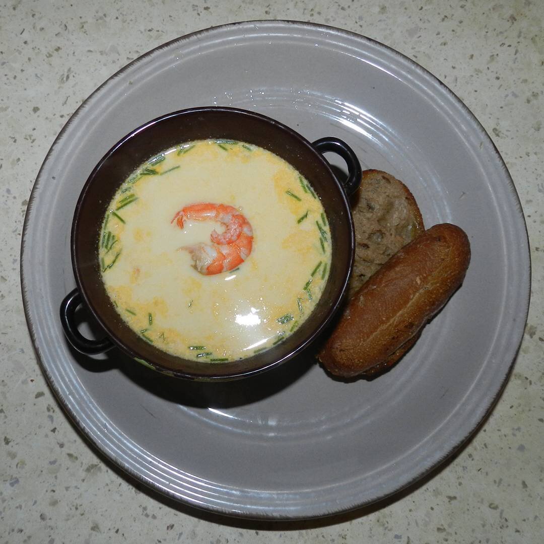 Ингредиенты: сливок, воды, луковица, грибов, болгарский перец, Укроп, варёных креветок, Морская соль, Хлебные сухари, Рыжиковое масло