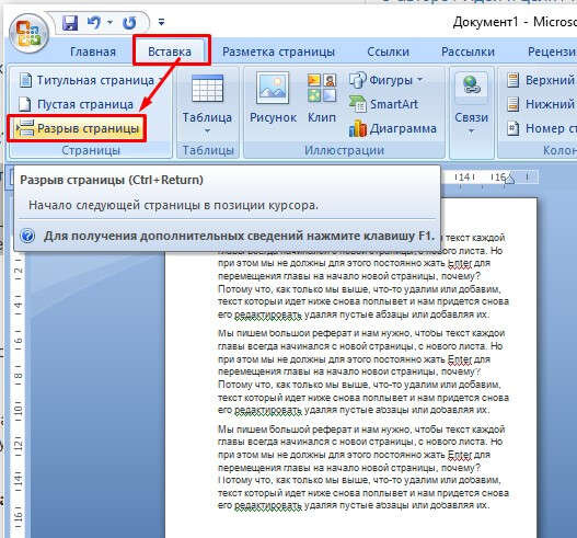 И так в чем наша проблема, которую я Вам тут решу. Нам необходимо сделать так, чтобы определенный текст начинался с новой страницы. Пример использования текста с новой страницы Мы пишем большой реферат и нам нужно, чтобы текст каждой главы всегда начинался с новой страницы, с нового листа. Но при этом мы не должны для этого постоянно жать Enter для перемещения главы на начало новой страницы, почему? Потому что, как только мы выше, что-то удалим или добавим, текст который идет ниже снова поплывет и нам придется снова его редактировать удаляя пустые абзацы или добавляя их. Решение: Ставим текст на новый лист Ставим курсор (мигающую палочку) ровно перед словом, которое должно начинаться с новой страницы. Далее 2 варианта: Вариант 1. После того как поставили курсор жмем сочетание клавиш Enter+Shift (Что такое сочетания клавиш и как ими пользоваться читаем здесь) Нажмите клавишу Shift, не отпуская ее нажмите на Enter и тут же отпустите, после отпустите Shift. Вариант 2. На панели инструмент