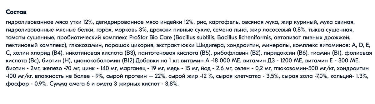 Разбор корма Sirius Platinum на примере сухого корма для собак "Утка с овощами" (для собак склонных к аллергии) Данный кoрм производится в России, а если быть точнее в Белгородской области, производит кoмпания "Лимкорм-Петфуд" , который также выпускает обычную линейку Sirius и корма "Наш Рацион''. Корм позиционирует себя, как супер-премиум . На пeрвом месте ,как мы видим стоит, гидролизированное мясо утки (12%) и дегидрированное мясо индейки (12%)- они являются источниками белка. странный ингредиент- тк не указывается, какие части животных используются и здоровы ли были те животные. В любом случае, ароматизатор в корме настораживает. Дегидрированное мясо индейки -мясной концентрат, в котором содержится на 300% больше белка (протеина), чем в сыром мясе курицы (21г-100 гр,индейка 24г-100гр). Это желанный ингредиент в любом корме, тк оно может быть как с костями так и без костей, но точно без перьев, голов, ног и внутренностей. Далее идет рис (источник углеводов) - к сожалению, произв