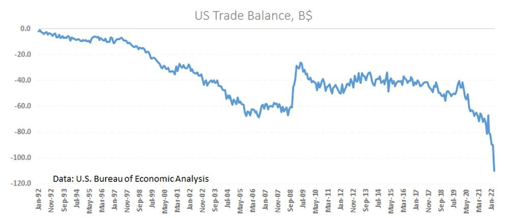 За один лишь месяц стоимость импорта взлетела более чем на 10%, почти вдвое сильней, чем прибавлял экспорт. Вполне возможно, что по итогам следующего месяца ситуация кардинально изменится, так как курс доллара укрепился на 6% за апрель, а Штаты наращивали поставки нефти и газа в ответ на отказ многих покупателей от энергоносителей из России.