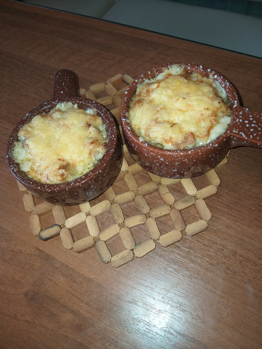 Что такое жюльен? Концепция этого блюда проста. Это обжареные овощи, мясо и грибы, залитые в порционной посуде соусом и запеченные в духовке с посыпкой сыра сверху. Овощи это в основном лук, но возможен вариант и с морковью, и с сельдереем, и с другими овощами. Мясо возможно любое, мне нравится куриные потрошка, филе куриных бёдер, или нежёсткая свинина. Грибы тоже возможны любые, те, которые можно жарить и тушить. Соус можно сметанный, можно на майонезе, мне нравится на сливках. Итак, способ приготовления: Лук и грибы порезать мелко и обжарить на растительном масле. Когда грибы выделят сок, потушить немного, добавить порезаное на кусочки мясо, посолить, поперчить и тушить с полчаса до готовности мяса. Соус. В небольшой сотейник бросить грамм 30 сливочного масла, растопить, замешать с 2 - 3 столовыми ложками муки и понемногу влить стакан сливок любой жирности. Добавить щепотку соли и приправу по вкусу. Мне нравится мускатный орех. Довести до кипения и как соус загустеет, снять