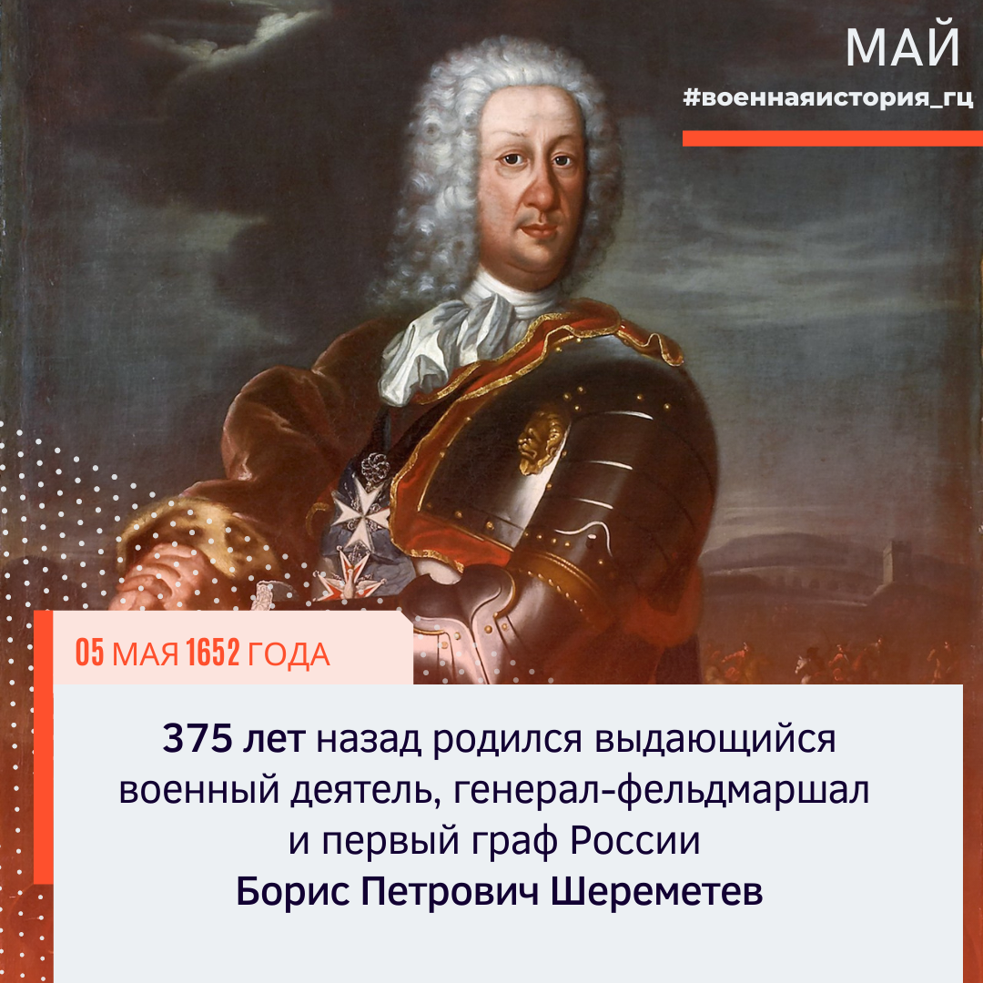 5 мая (25 апреля) 1652 г. родился выдающийся военный деятель, генерал-фельдмаршал и первый граф России Борис Петрович Шереметев. В 1681 г. его назначили тамбовским воеводой, после чего он командовал войсками, действовавшими против крымских татар. В 1682 г. получил боярский титул. В эти годы проявились блистательные дипломатические способности Бориса Петровича, благодаря которым он содействовал подписанию «Вечного мира» с Польшей который позволил России закрепить за собой Киев. Самым главным делом жизни для Бориса Петровича было служение России, поэтому он старался держаться далеко от московских междоусобиц. Северная война сделала Шереметьева известным во всём мире. После нарвского конфуза Пётр I сам попросил помощи у Бориса Петровича в налаживании эффективного командования армией. Будущий граф принял решение модернизировать комплектование армии и провести обучение солдат основам современной боевой подготовки. Вначале Шереметев действовал неактивно, но в декабре 1701 г. в сражении у сел