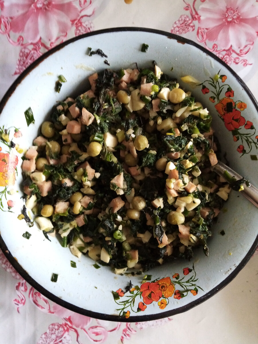 Доброго времени суток уважаемые подписчики и гости канала! Моим регулярным читателям известно, что в первых числах мая мы с семьёй гостили на фазенде свекрови. Она у меня - великий комбинатор: то драники с овсянкой "Ум отьешь" приготовит, то салат крапивный замутит. На этот раз был салат. Не смогла оторваться от него, пока не закончился. Очень рекомендую. Итак, ингридиенты: -свежая крапива(ошпареные кипятком листочки) - грамм 300 -клубни топинамбура - грамм 200 -зеленый горошек - половина большой банки -2 яйца -пара кругляшков колбасы(на мой взгляд, можно исключить, но так как рецепт авторский, перечислю) - грамм 60 -зелёный лук -листья чеснока -горчичное масло - пара столовых ложек Всё мелко нарезаем, особенно горчичное масло))). Солим-перчим и перемешиваем. Все, вкусняшка готова. Давайте делитесь, а чем вас потчевали?