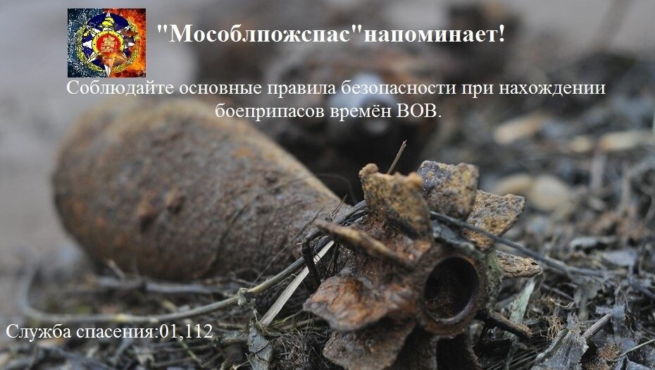 Отгремели залпы Великой Отечественной войны, но и в наши дни при проведении строительных и земляных работ находят боеприпасы времен войны.Все эти предметы представляют огромную опасность для людей.Не пытайтесь самостоятельно исследовать обнаруженные боеприпасы и тем более обезвреживать! Это сохранит не только Вашу жизнь, но и жизни окружающих! Работники ГКУ МО "Мособлпожспас" напоминаютРаботники ГКУ МО «Мособлпожспас» напоминают, что в случае обнаружения взрывоопасного предмета или внешне схоже с ним предмета необходимо: -Не предпринимать никаких самостоятельных действий; -Ни в коем случае не трогать, не перемещать, не закрывать чем-либо этот предмет; - Не пользоваться вблизи него электро-радиоаппаратурой; - Не оказывать на предмет температурного, звукового, механического и электромагнитного воздействия. Все эти действия могут привести к несанкционированному взрыву; -По возможности до прибытия специалистов принять меры по недопущению к месту обнаружения подозрительного предмета друг