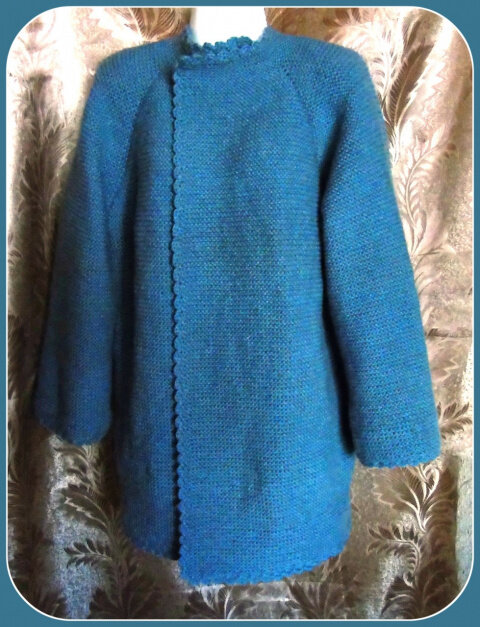Размер 46-50. Вам понадобится 1000 - 1200 пряжи с толщиной нити 150-180 м. на 100 гр., круговые спицы №3. Основной узор - платочная вязка Жакет вяжется сверху вниз и здесь мы будем рассматривать, как расчитать линию реглана. Высота реглана 21 см. На более большой размер можно вязать на высоту 24-26 см. На меньший размер 18 см. Набрать на спицы 100 петель и вязать на высоту стойки 14 рядов, затем разделить полотно так - 12 планка, 12 передняя полочка, 1 петля реглана, 12 рукав, 1 петля реглана, 24 спинка, 1 петля реглана, 12 рукав, 1 петля реглана, 12 полочка, 12 планка. На меньший размер убрать по 2-4 петли на спинке , полочках и планке. Вязать прибавляя по 2 петли по линии реглана с двух сторон петли регланной линии на каждом ряду лицевой стороны. Вязать на высоту проймы. Разделить полотно и вязать рукава, прибавив под проймой по 4-5 петель с двух сторон рукава. Зашить рукава собрать все открытые петли на 1 спицу и вязать спинку и полочки одним полотном на нужную длину. Отделка крю