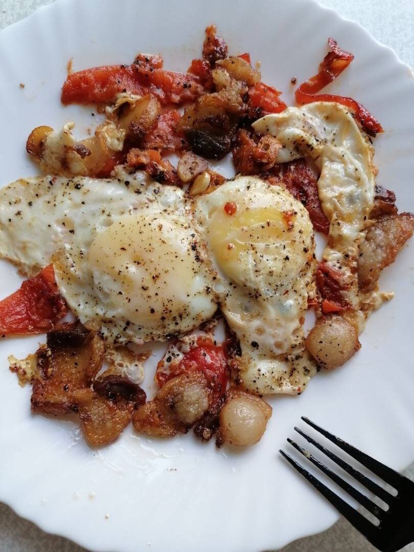 #яйцо #меню #приятногоаппетита Ингредиенты: яйца, сало свежее, помидор, соль и специи, по желанию зелень, чеснока Способ приготовления: Сало разрезаем на нужные нам кусочки и на горячую сковороду. Немного соли и смесь перцев. Когда появилась корочка переворачиваем. Чеснок тонкими пластинами. Помидор тоже нарезаем как получиться \ у меня была мягкая поэтому не получилось ровными кружочками \отправляем к салу. Вот теперь разбиваем яйца, присолили и поперчили, можно еще какую хочется приправу. На медленном огне доводим до готовности. Сверху можно присыпать зеленью. У меня ее не оказалось. ВСЕМ ПРИЯТНОГО АППЕТИТА.