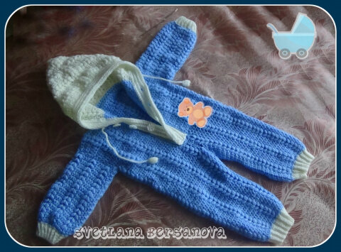 Вам понадобится пряжа с толщиной нити примерно 240-280 м. на 100 гр. 350-400 гр Крючок №2 Мерки для работы: Высота комбинезона без капюшона 50см., обхват талии 50 см., высота шага (мерка внутреннего шва штанин) 22-23см вместе с резинкой, высота от резинки штанин до проймы 36-37 см.,длина рукава вместе с резинкой - 18-19 см., высота капюшона 17-19 см., ширина капюшона -1/2 - без планки 17-18 см. Узор: пышный ст. из 3-х вытянутых петель, 2 в.п., пышный ст, 3 полуст. с н. Порядок работы: Сперва связать две резиночки для штанин белой нитью, и далее вязать голубой пряжей узором на высоту половины высоты шага и сделать прибавки, как показано в видео. Вязать обе штанины одновременно. Далее соединить обе штанины и вязать на высоту 3-4 рядов до планки и вязать не по кругу а прямым полотном до проймы. Разделить полотно на полочки и спинку и все детаои вязать по отдельности. Обвязать по кругу линию планки и горловины и связать стойку воротника. Переходим на капюшон и вяжем белой пряжей капюшон пр