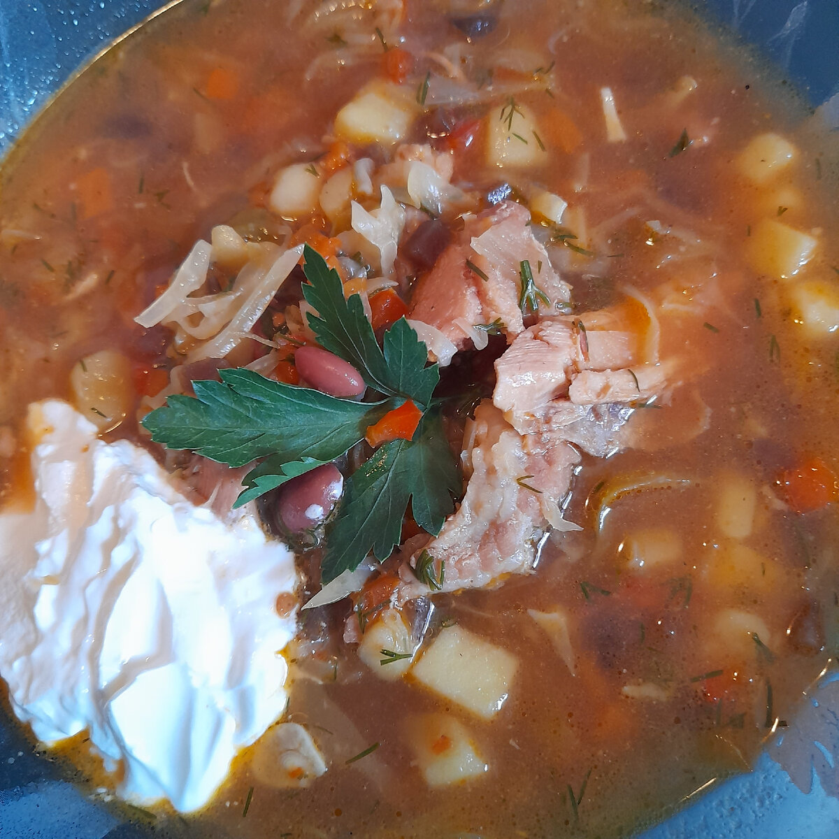 Сегодня хочу познакомить Вас с необычным супчиком. Сытным, полезным и конечно вкусным. С таким спектром овощей может сравниться только украинский борщ, но о нем в следующих статьях. На сегодняшний день насчитывается 150 видов супов, наш будет 151 :) Весь овощной отдел сегодня наш: Картофель – 400 гр. (4 шт. средний); Морковь -170 гр. (1 шт.); Лук репчатый – 125 гр. (1 шт.); Капуста «молоденькая» - 450 гр.; Свекла консервированная – 250 гр.; Фасоль красная консервированная – 190 гр.; Перец болгарский красный – 100 гр.; Томатная паста- 2 ст. л.; Укроп – 30 гр.; Чеснок – 3 зубчика; Перец черный, соль по вкус, лавровый лист. Бульон сегодня на ваш вкус – 2,5 литра. У меня кролик. Варился 2,5 часа на медленном огне. Мясо с кости обобрала и оставила в супе. По мере выпаривания жидкости добавляла горячую воду. Кость голодные собачки оценили :))) Нарезка овощей: Отталкиваемся от нарезки свеклы в банке. Сегодня картофель, морковь, лук, перец режем кубиком. Капусту шинкуем соломкой. В бульон высы